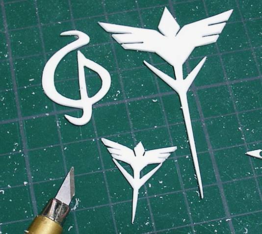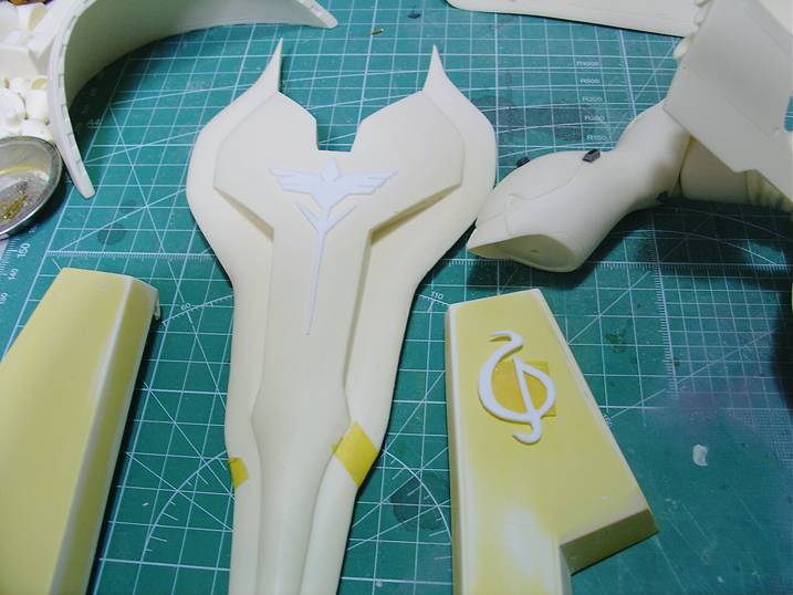 胸部側面に付くエンブレムもレジンのランナーを使用して彫り込んでいきます。