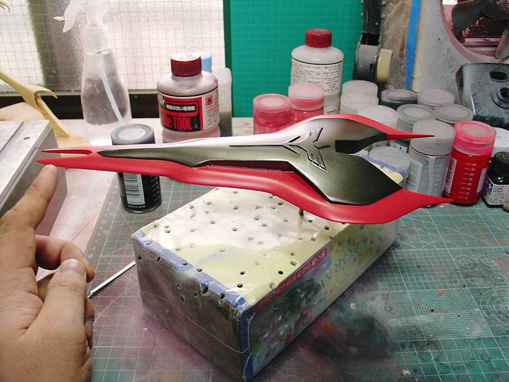 シールドと固定ピンの干渉するファンネル以外の赤の塗装を終えました。